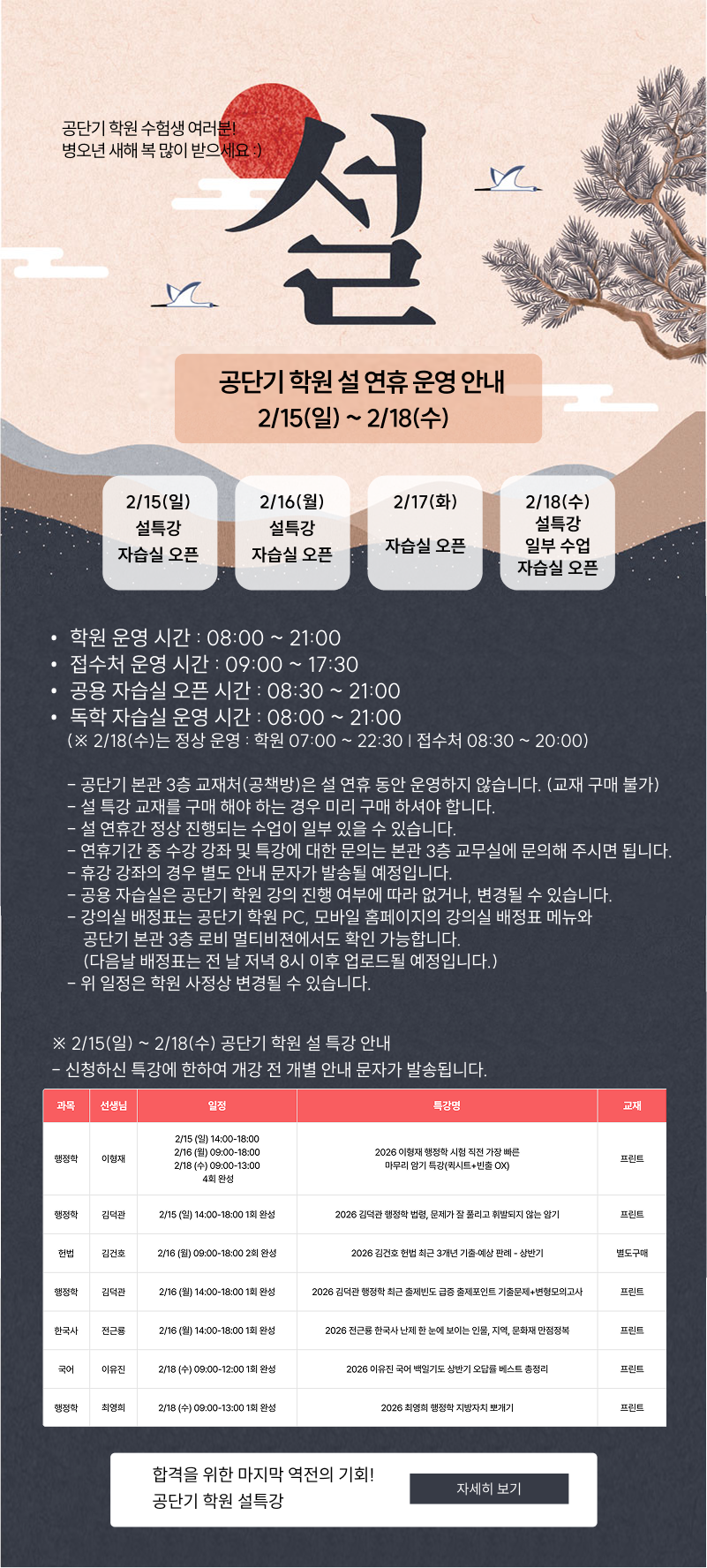 [노량진] 공단기 학원 2026년 설 연휴 기간 운영안내